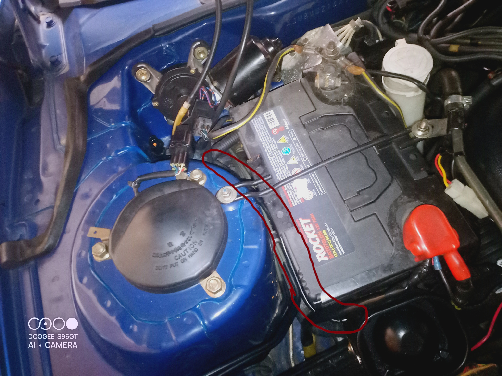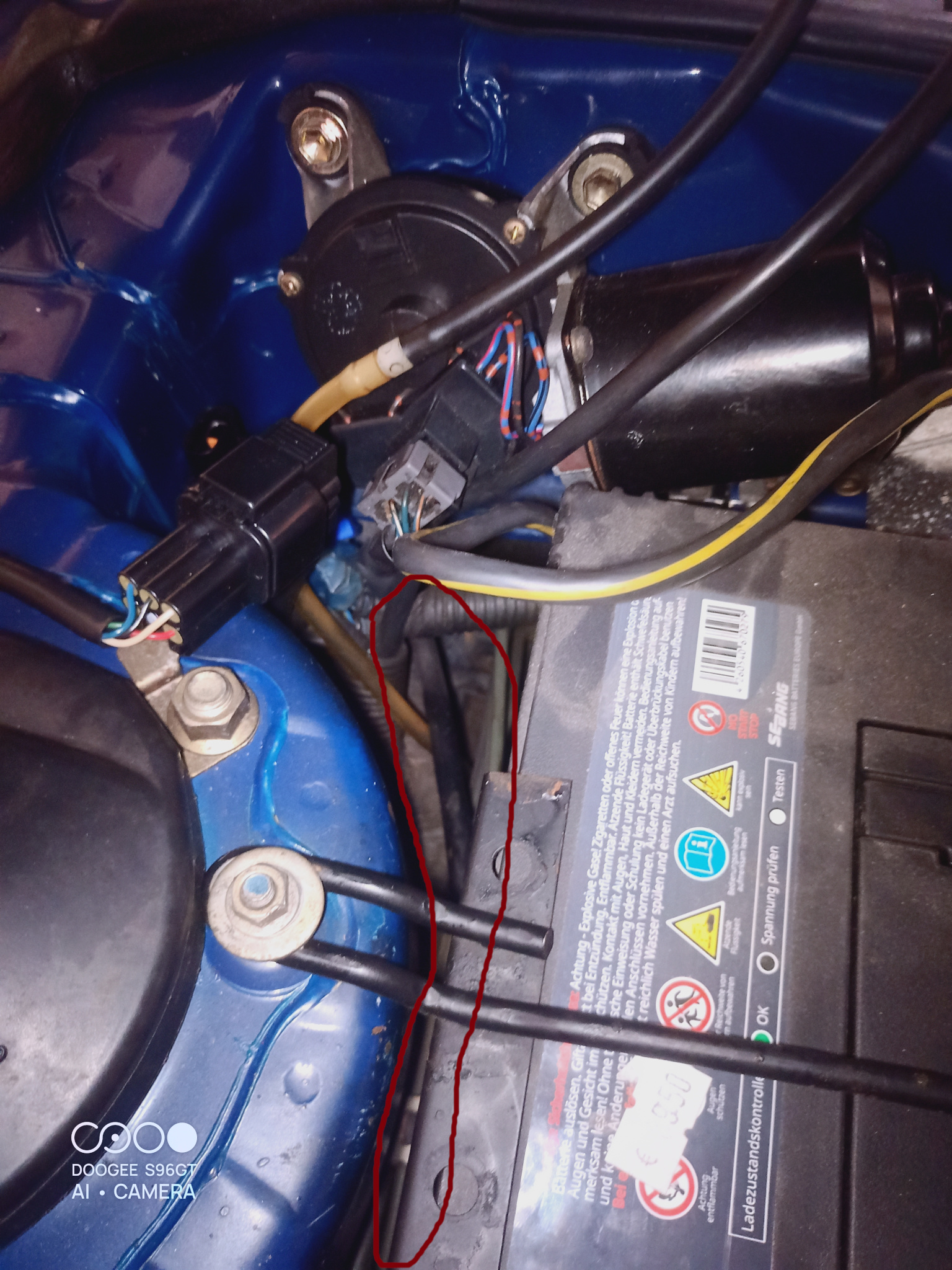 In meiner Euphorie, hab ich beim einheben der Batterie dummerweise das schwarze Kabel, dass, von vorne gesehen, links an der Batterie vorbeigeht mit eingeklemmt.