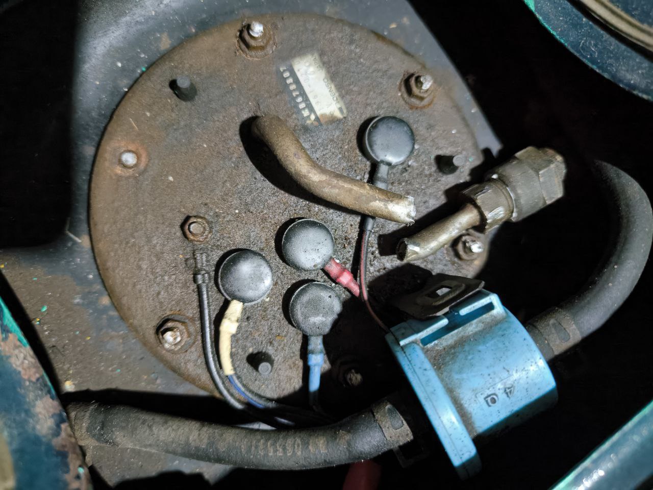Die übliche Problmatik: Um die Benzinpumpe samt dem Träger aus dem Tank zu holen, muss man 6 Mutter von Stehbolzen abschrauben und die Benzinleitung von der Pumpen-Ausgangsleitung trennen.